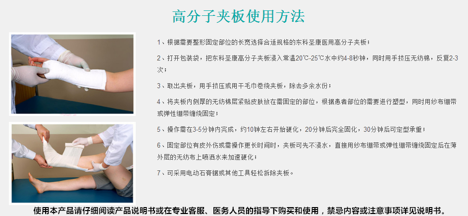 如果我們準(zhǔn)備使用高分子繃帶夾板,要注意的是每次打開(kāi)一個(gè)包裝要立即使用,而且只能打開(kāi)一個(gè),不要同時(shí)打開(kāi)多個(gè)包裝,這樣做是為了防止高分子繃帶夾板遇潮變硬,影響其固定過(guò)程中的使用強(qiáng)度。此外,我么東科圣康品牌的高分子繃帶夾板應(yīng)貯存在陰涼干燥、濕度低于RH`,空氣流通的地方,使用高分子繃帶夾板時(shí)建議由有資格的醫(yī)生操作或指導(dǎo)。