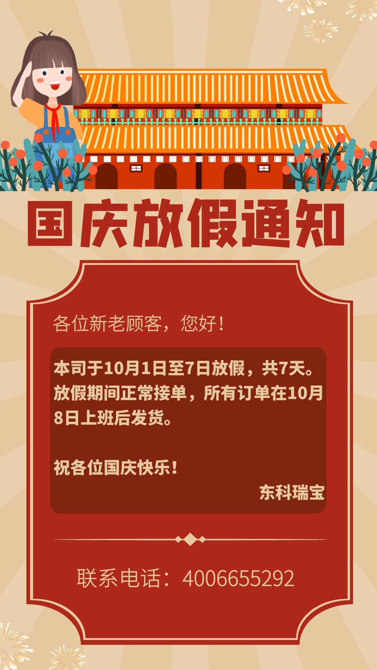 本司于10月1日至7日放假,共7天。放假期間正常接單,所有訂單在10月8日上班后發(fā)貨。