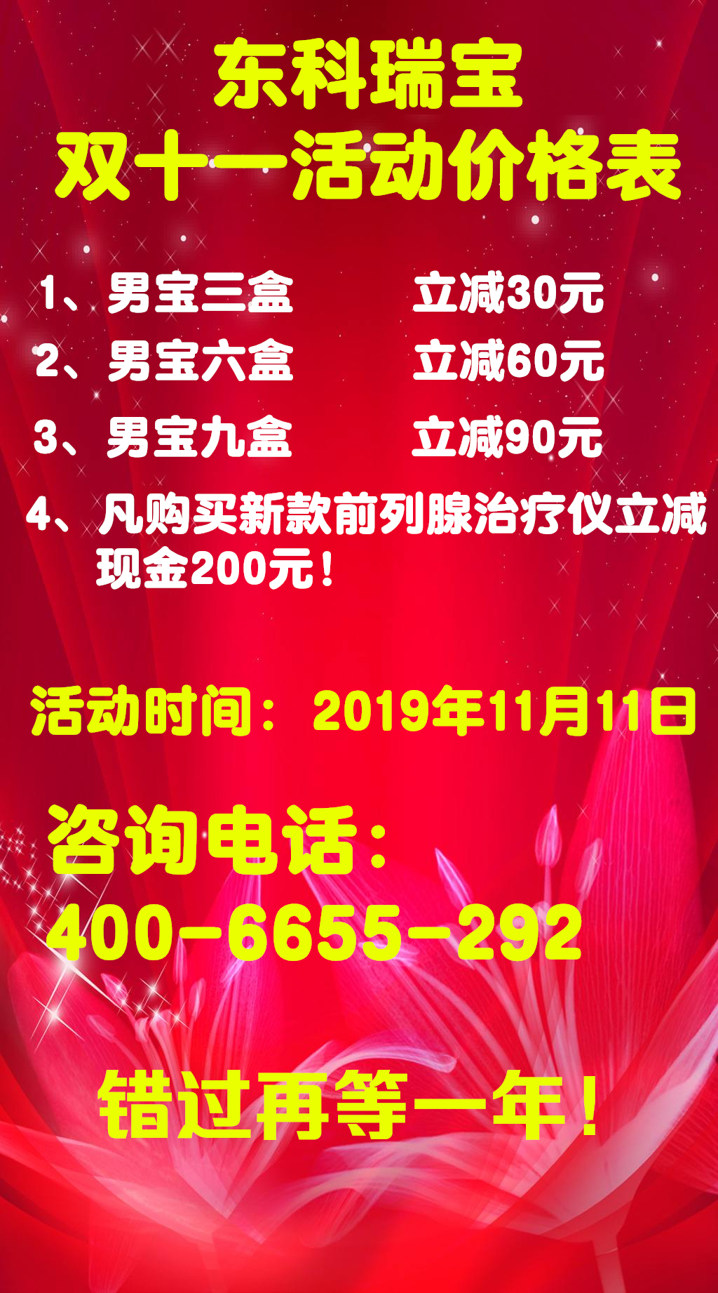 東科瑞寶前列腺治療儀雙十一大促 錯(cuò)過再等一年! 東科瑞寶前列腺治療儀廠家雙十一大促,購買男寶抗菌凝膠3盒立減30,6盒立減60,9盒立減90!購買新款儀器,立減現(xiàn)金200元!活動(dòng)僅限2019年11月11日當(dāng)天!錯(cuò)過再等一年!