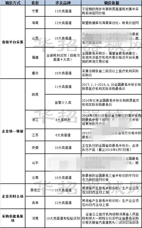 而自2013年國(guó)家發(fā)布86號(hào)文后,各地積極部署省內(nèi)集中采購工作,到2018年絕大多數(shù)省份新一輪高值醫(yī)用耗材集中采購相繼完成,價(jià)格聯(lián)動(dòng)、動(dòng)態(tài)調(diào)整成為各地招采工作的重頭戲,整個(gè)耗材集中采購環(huán)境呈現(xiàn)出“參考全國(guó)***價(jià)”、“一地更比一地低”的特點(diǎn)。政策吹風(fēng)適逢合適的集采時(shí)機(jī),多省在近兩年掀起大規(guī)模的調(diào)價(jià)風(fēng)云。