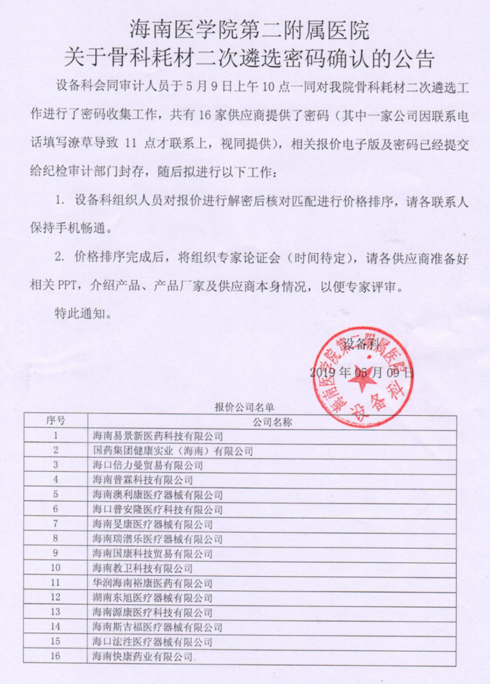 海南醫(yī)學(xué)院第二附屬醫(yī)院設(shè)備科會同審計人員于5月9日上午10點,一同對我院骨科耗材二次遴選工作進行了密碼收集工作,共有16家供應(yīng)商提供了密碼(其中一家公司因聯(lián)系電話填寫潦草導(dǎo)致11點才聯(lián)系上,視同提供),相關(guān)報價電子版及密碼己經(jīng)提交給紀檢審計部門封存,隨后擬進行以下工作: