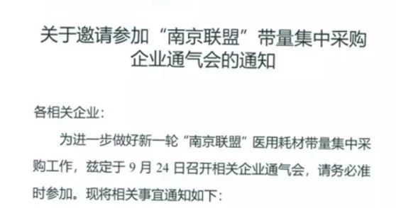 近日,一份《關(guān)于邀請(qǐng)參加“南京聯(lián)盟”帶量集中采購企業(yè)通氣會(huì)的通知》在業(yè)內(nèi)流傳,顯示為進(jìn)一步做好新一輪南京聯(lián)盟醫(yī)用耗材帶量集中采購工作,茲定于9月24日召開企業(yè)通氣會(huì)。