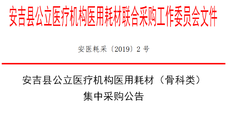根據(jù)《安吉縣公立醫(yī)療機(jī)構(gòu)醫(yī)用耗材集中采購(gòu)工作方案(試行)》(安公醫(yī)管辦〔2019〕5號(hào))、《安吉縣公立醫(yī)療機(jī)構(gòu)醫(yī)用耗材集中采購(gòu)實(shí)施細(xì)則(試行)》(安醫(yī)耗采〔2019〕1號(hào))等文件精神, 現(xiàn)就本次骨科類耗材集中采購(gòu)工作公告如下: